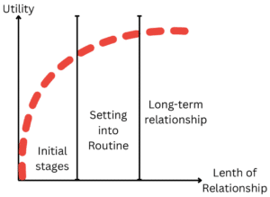 The law of diminishing marginal utility states that all else equal, as consumption increases, the marginal utility derived from each additional unit declines. Within the confines of our discussion, we can interpret each unit of good consumption as being each unit of time spent in the relationship. In the initial stages of a relationship, feelings are naturally more intense and this usually translates to greater feelings of joy stemming from the relationship. This feeling of joy will be our metric for utility, and its intensity being the unit. As we settle into routine within the relationship, the intensity slowly fades and turns into stability. Although the couple in the relationship may still be just as in love as in the start of the relationship, the intensity and passion has typically softened. Finally, as a relationship moves towards the long-term, a relationship generally reaches a stable equilibrium, being characterised by stable trust rather than burning passion. This understanding is illustrated in the following graph: